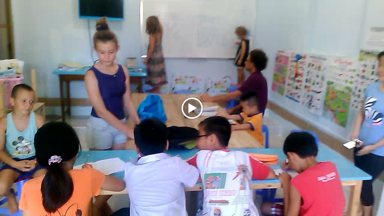 ה"כיתה" היא בעצם בחנייה של הבית, עם שולחנות, כסאות, פלקטים על הקירות, לוח והכל.
